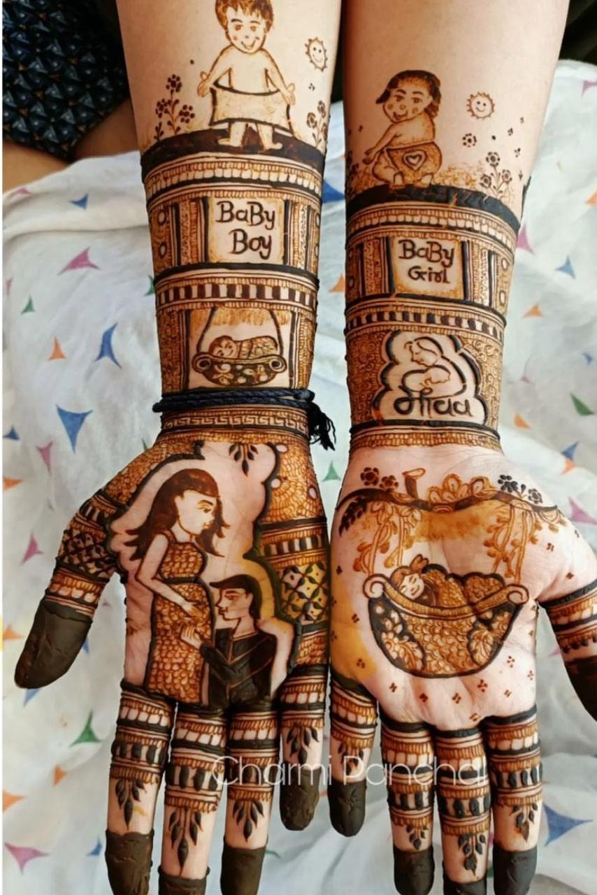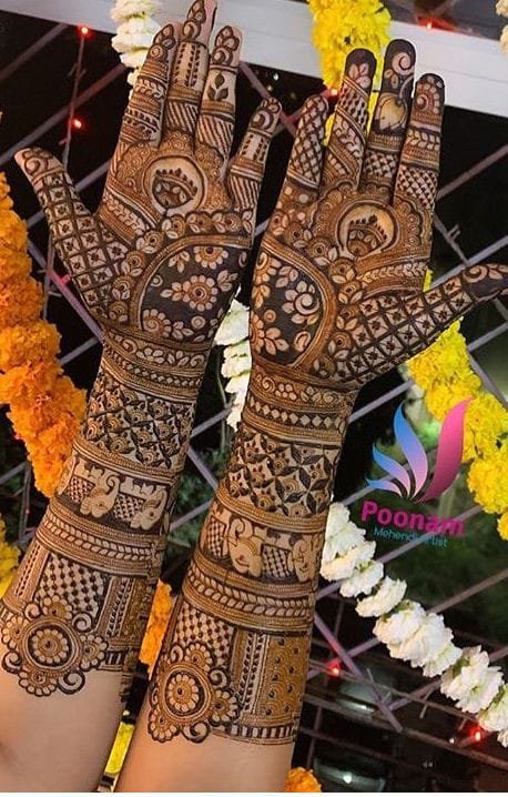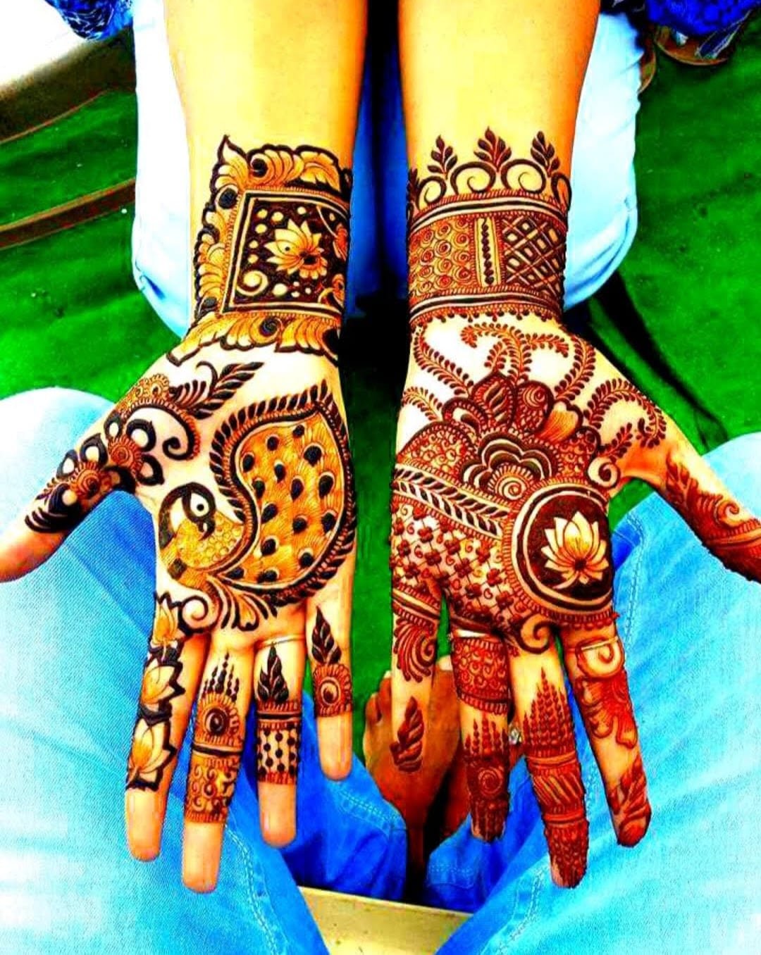 Gujarati mehndi patterns portray fabulous peacocks, leaves, flowers, and additional known trims.